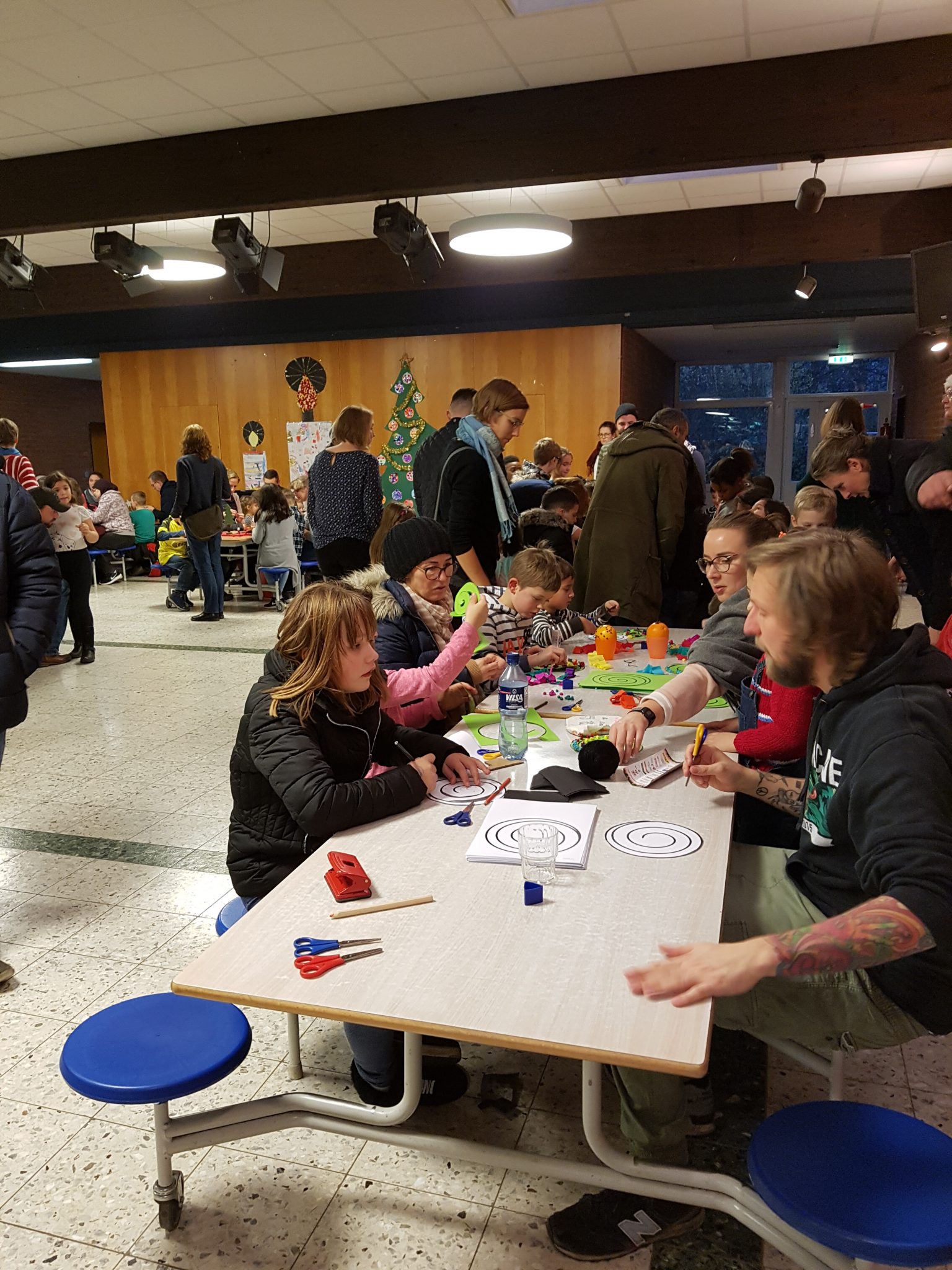Alle Lehrkräfte der Schule, hilfreiche Hände aus dem Ganztagsbereich und vom KiFaz hatten viele tolle Bastelarbeiten vorbereitet. So konnten zum Beispiel Schneemann-Grußkarten, Kirschkernkissen, Orangen gespickt mit Gewürznelken und Weihnachtsbaumanhänger an den verschiedenen Ständen hergestellt werden.
