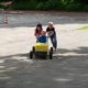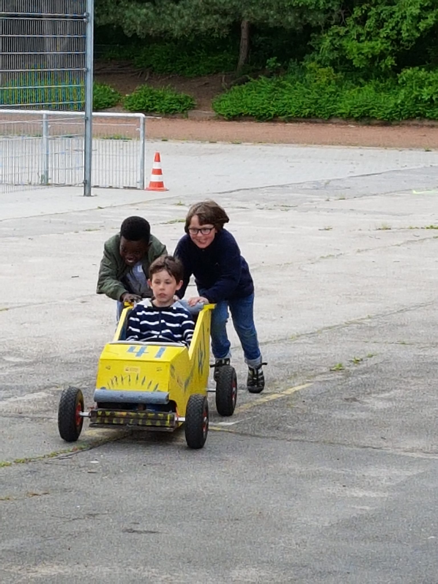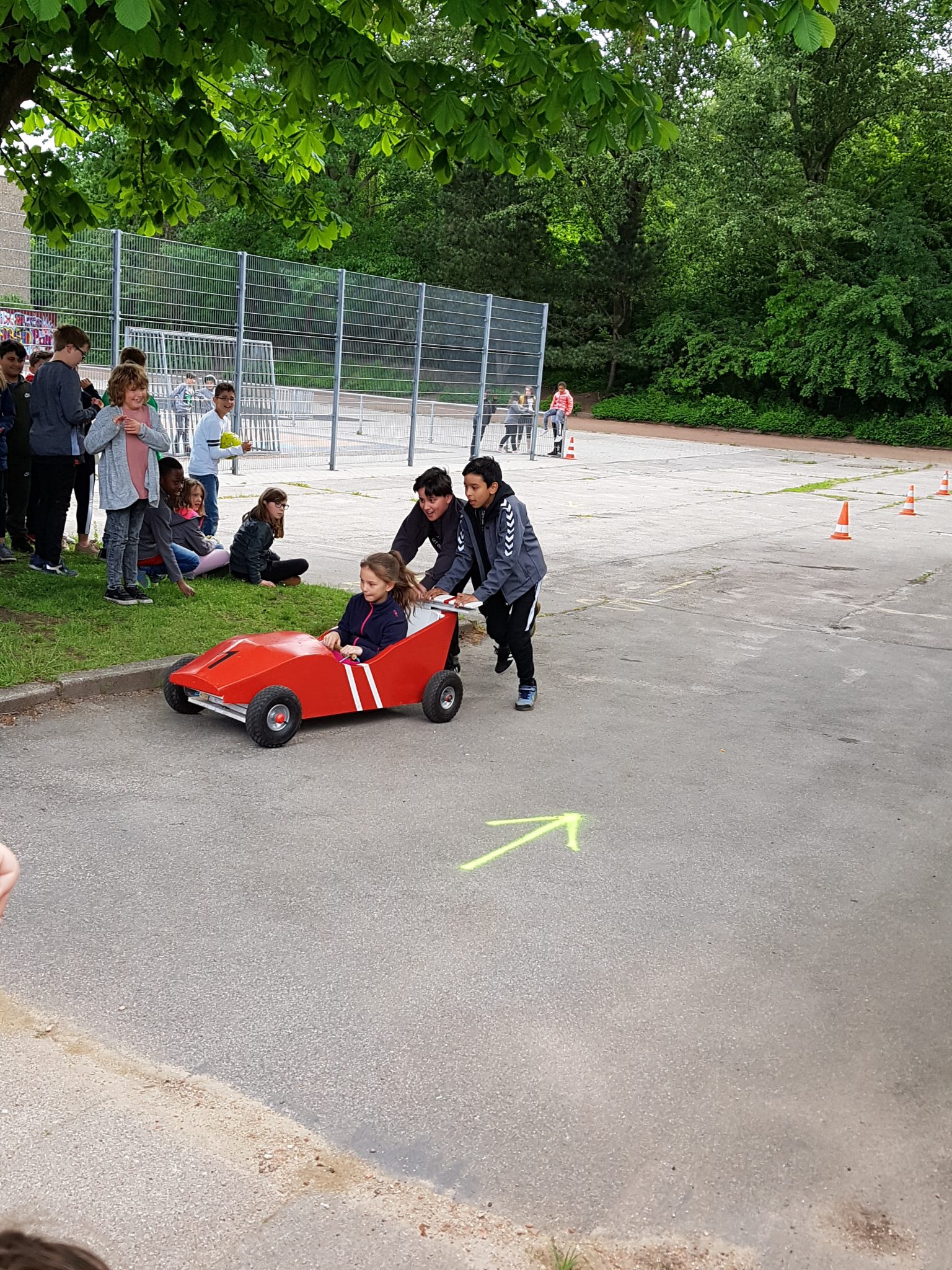 Jede Klasse stellt ein Team mit 4 Kindern: Einen Fahrer/ eine Fahrerin und zwei „Schieber“ (+ 1 Ersatzmann/frau).