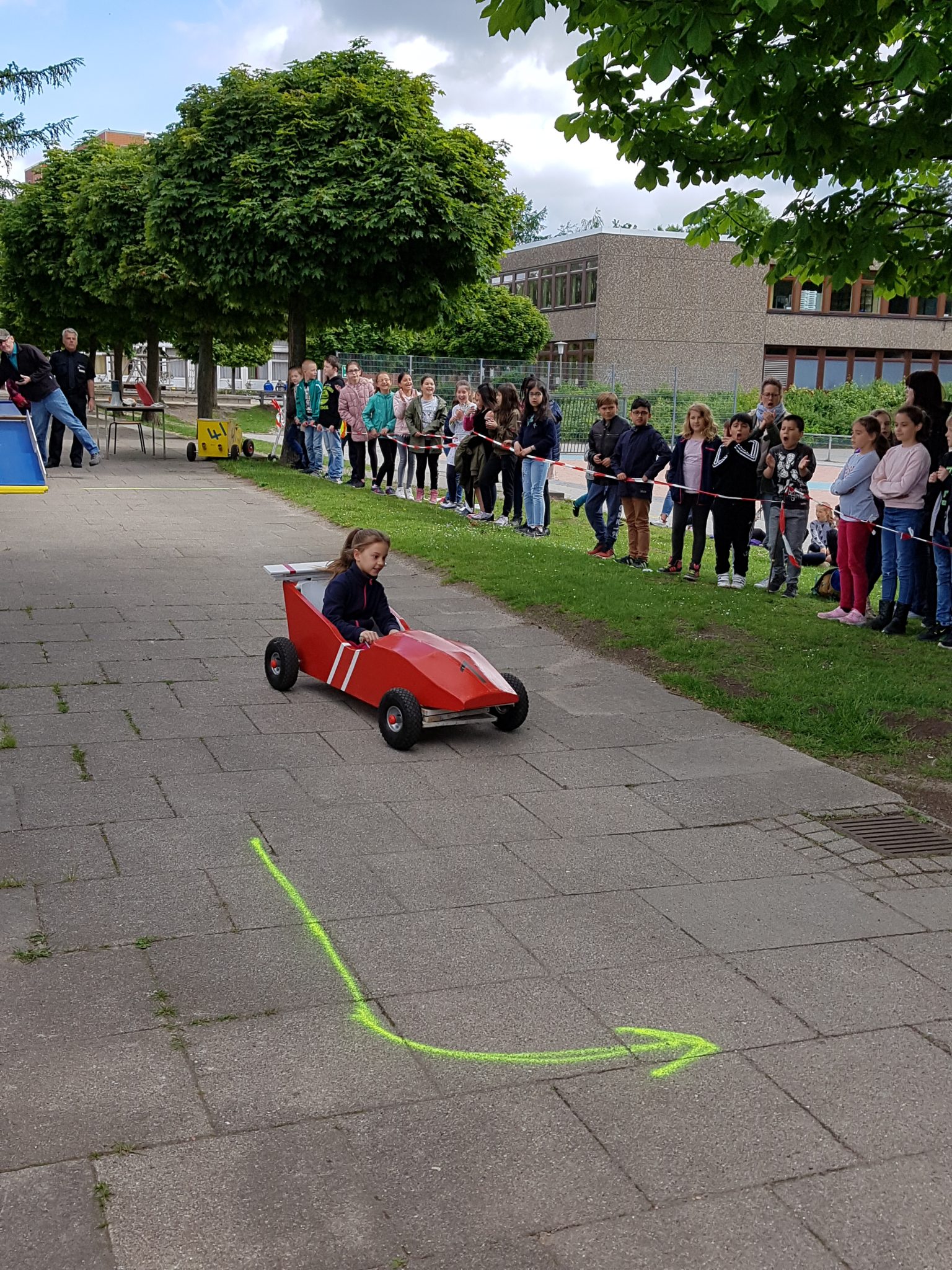 Von einer Rampe aus startet die Seifenkiste und rollt bis zu den beiden „Schiebern“. Die schieben dann mit Tempo die Seifenkiste plus Fahrer wieder zurück zum Ziel. Mit der Stoppuhr werden die Sieger ermittelt. Für die Jahrgänge 3 und 4 gilt eine verlängerte Strecke.