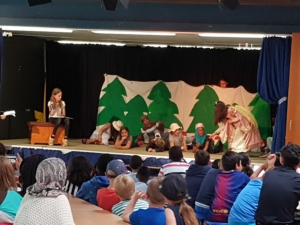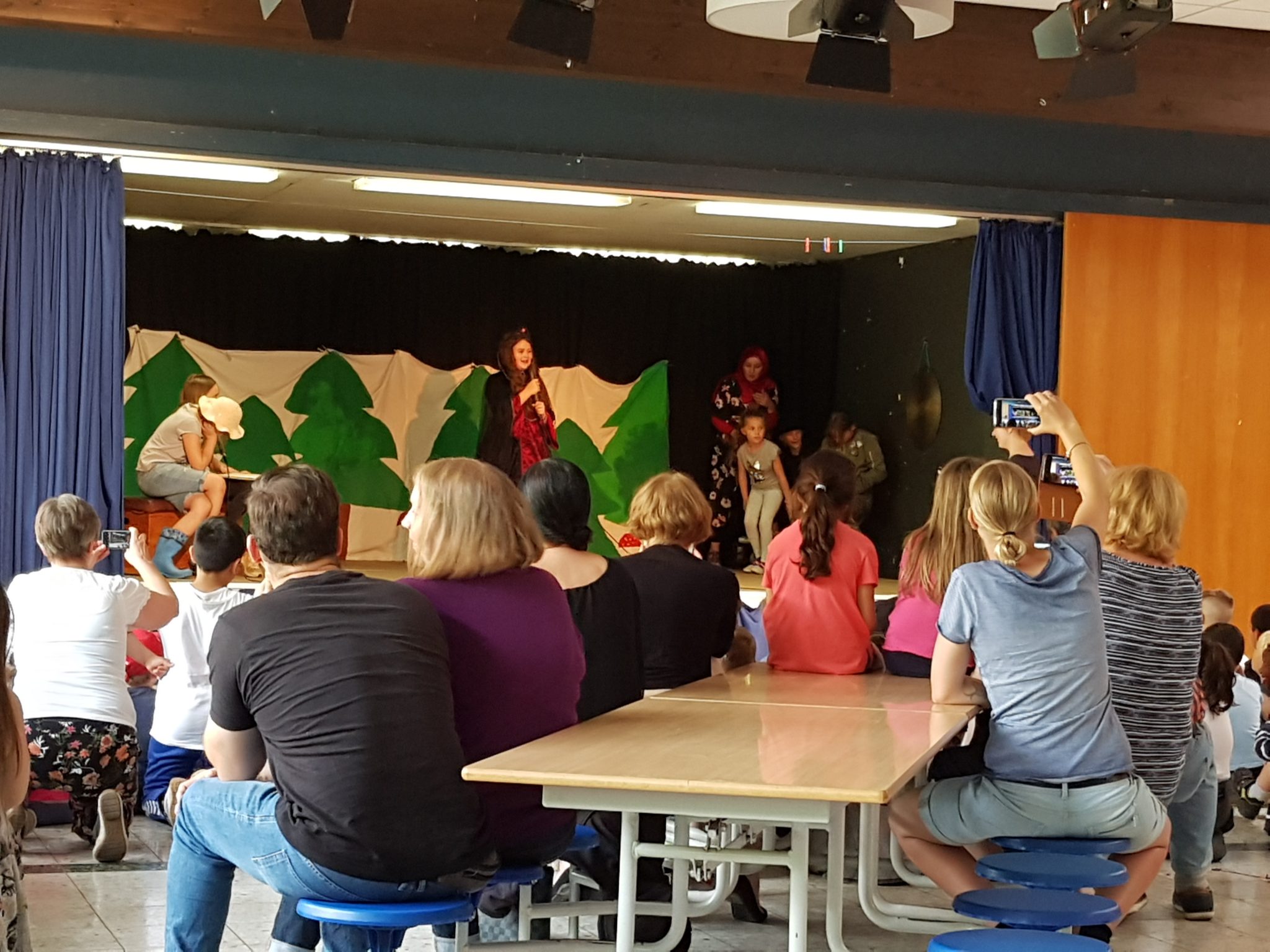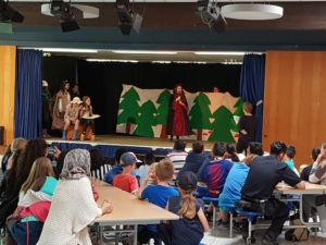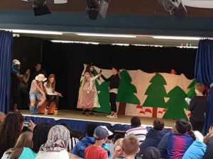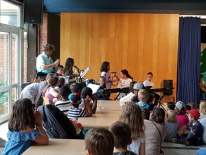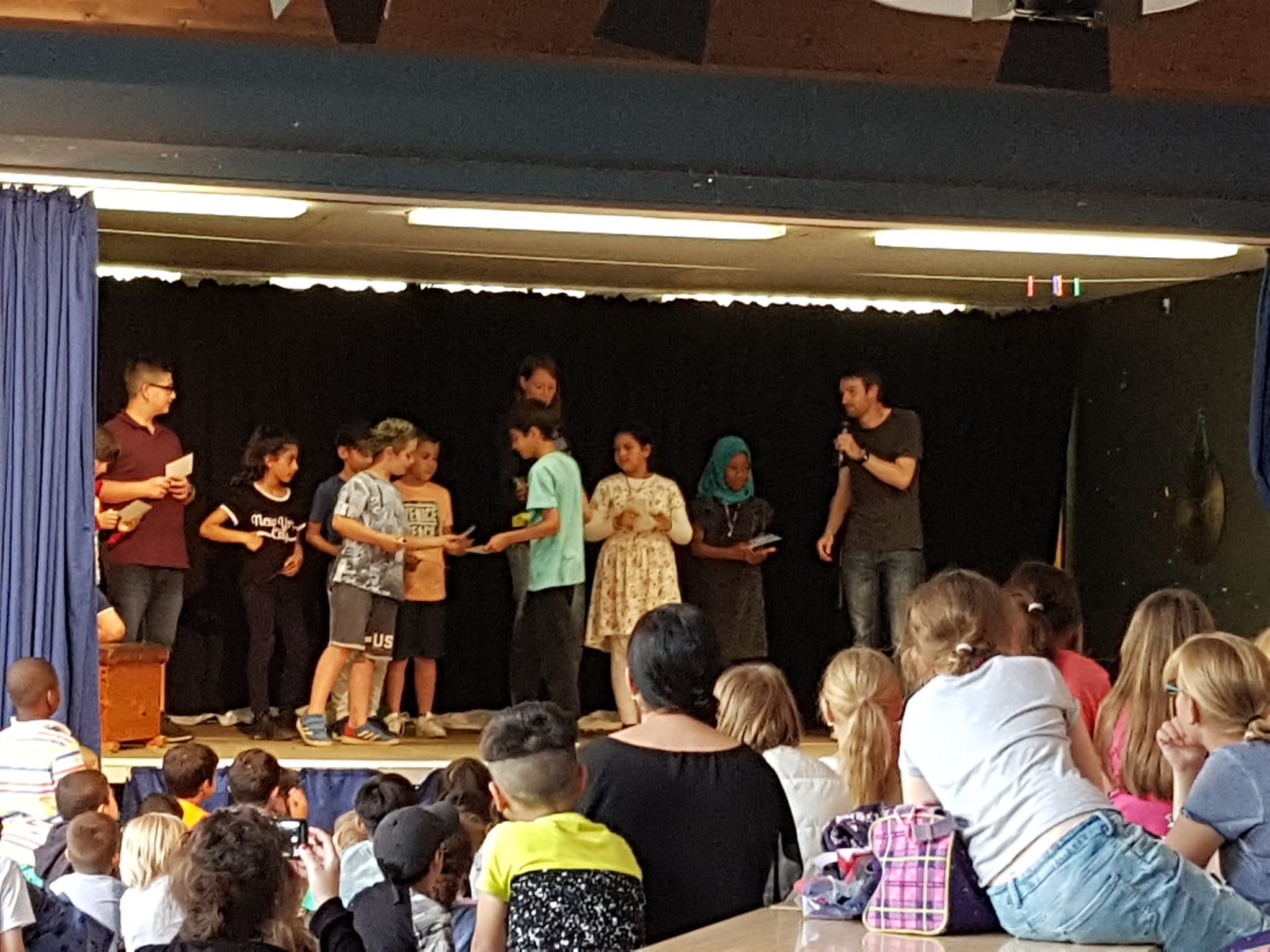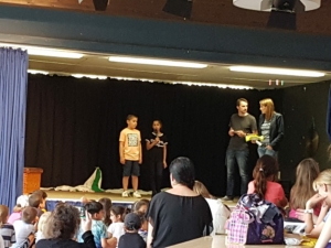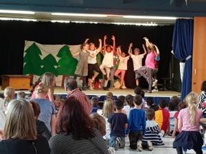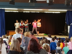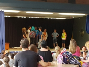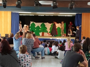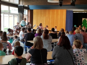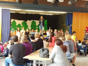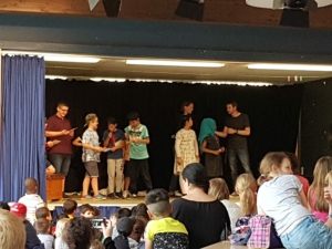 Am Donnerstag gab es verschiedene Aufführungen aus der Kursen der GTS: Das Schüler-Orchestern spielte ein selbst komponiertes Musikstück, die Theatergruppe spielte das Theaterstück „Schneewittchen und die 7 Millionen Follower“, der Yoga-Kurs präsentierte Entspannungsübungen, der Selbstverteidigungskurs stellte Szenen zum Thema Mobbing dar und im Rahmen des Internet-Kurses wurden die „Surf-Scheine“ verliehen.