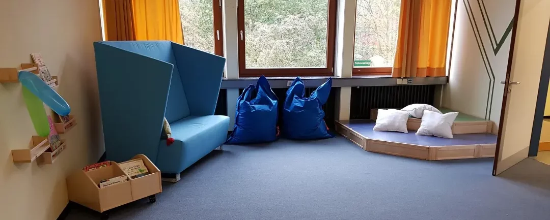 Sie ist mit einem gemütlichen Sofa, Sitzsäcken und einem Lesepodest ausgestattet.